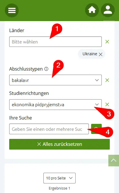2. Выберите страну, выдавшую диплом (1), полученную степень (2) и направление (3). Если список результатов будет очень обширным, можно использовать дополнительный фильтр (4).