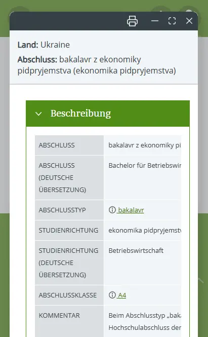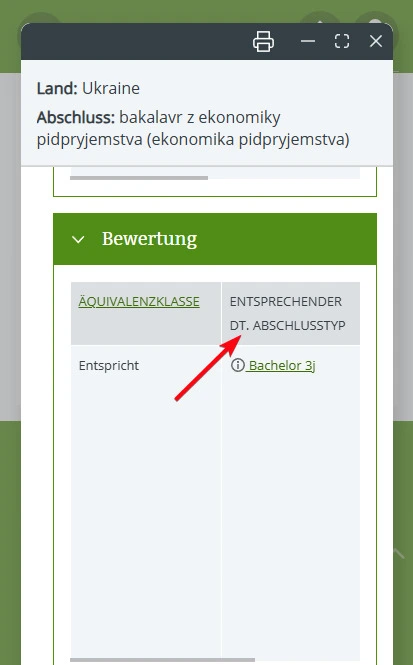 5. В разделе «Bewertung (Оценка)» в категории «Äquivalenzklasse (класс эквивалетности)» будет указано, соответствует ли образование немецким стандартам.