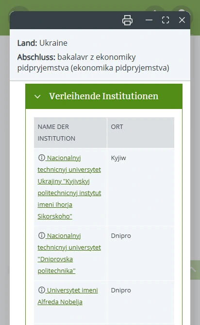 6. В разделе «Verleihende Institutionen (учебные заведения)» будет предоставлен список вузов, соответствующих указанным условиям.