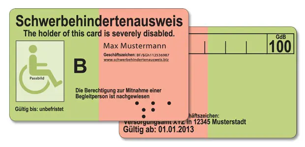 Любой человек с общей степенью инвалидности 50 получает удостоверение личности с тяжелой степенью инвалидности (Schwerbehindertenausweis), которое предоставляет ему права и льготы. Оно призвано расширить возможности участия людей с инвалидностью в общественной жизни. Процесс подачи заявления сложен, рассмотрим его ниже во всех подробностях.