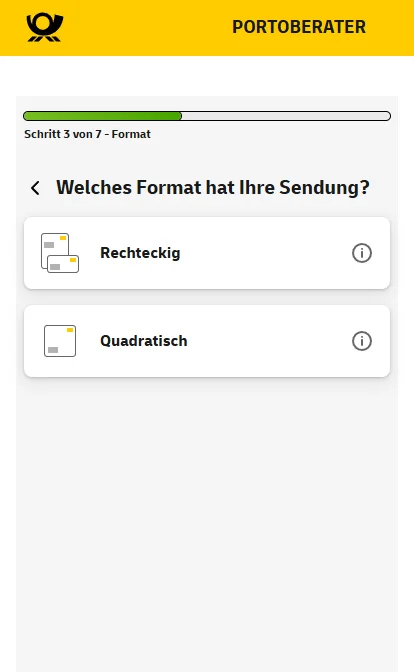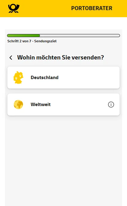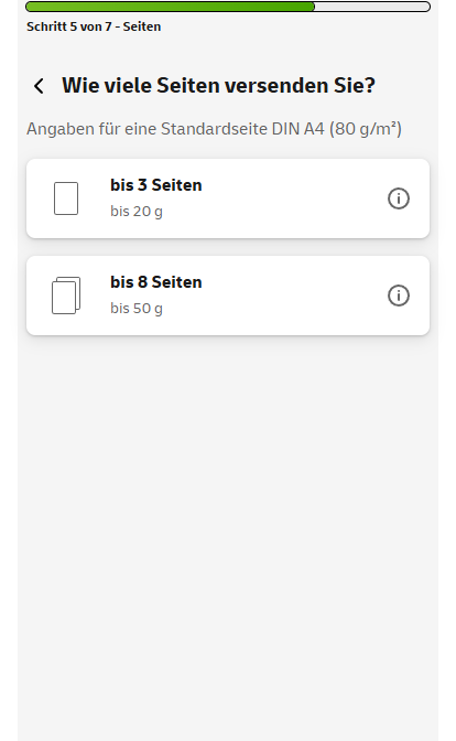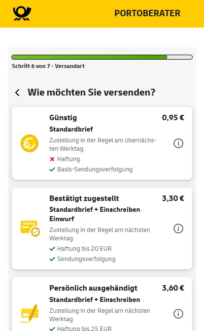- Выберите тип отправки: Günstig Standardbrief (стандартное, недорогое), Bestätigt zugestellt (подтвержденная доставка), Persönlich ausgehändigt (личное вручение), Schnell (быстрая доставка).