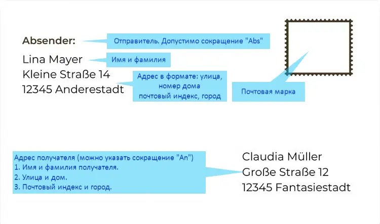 Для отправки письма внутри Германии конверт подписывается следующим образом: