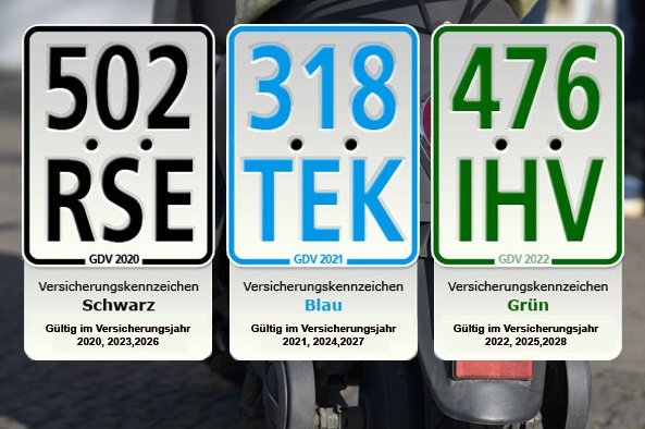 Страховой год для E-Scooter, мопедов и аналогичных транспортных средств длится с 1 марта по последний день февраля следующего года. Полис необходимо продлевать ежегодно, и каждый год страховые таблички меняют цвет. В период с 1 марта 2026 года по 28 февраля 2027 года действуют таблички черного цвета. Езда со страховой табличкой прошлого года (например, зеленой или синей в марте 2026 года) приравнивается к отсутствию страховки и является уголовным преступлением, наказуемым штрафом или лишением свободы на срок до одного года.