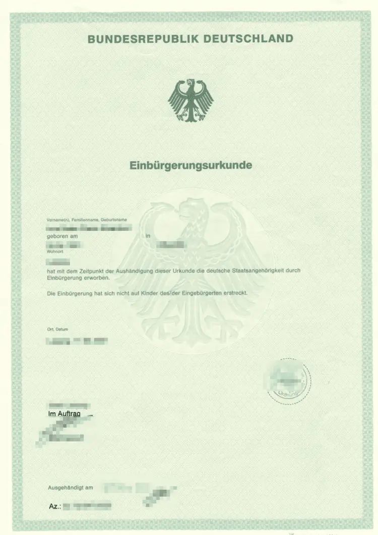 В случае положительного решения, а также после подписания необходимых документов (приверженность свободному демократическому основному порядку, исторической ответственности Германии за несправедливость национал-социализма), заявителю будет предоставлено гражданство Германии. На первом этапе подтверждением этого факта является свидетельство о натурализации (Einbürgerungsurkunde).